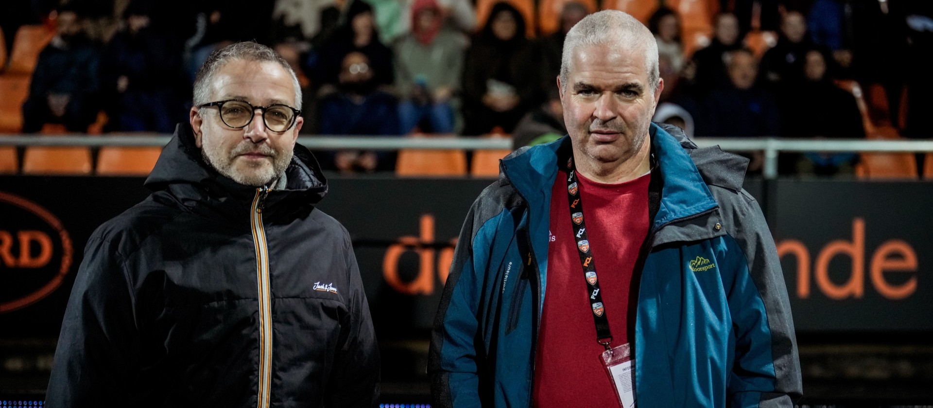Mickaël, l’heureux gagnant de la loterie, s’est vue remettre la box en bord terrain lors de l’échauffement des joueurs par Cyrille, responsable du Banc de Merlus,