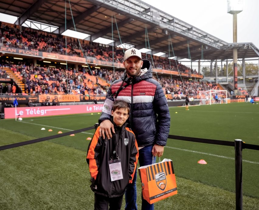 Yann et Louis, vainqueurs de la loterie, se s’ont vus remettre le maillot en bordure de terrain en avant match de la rencontre FCL – Monaco.