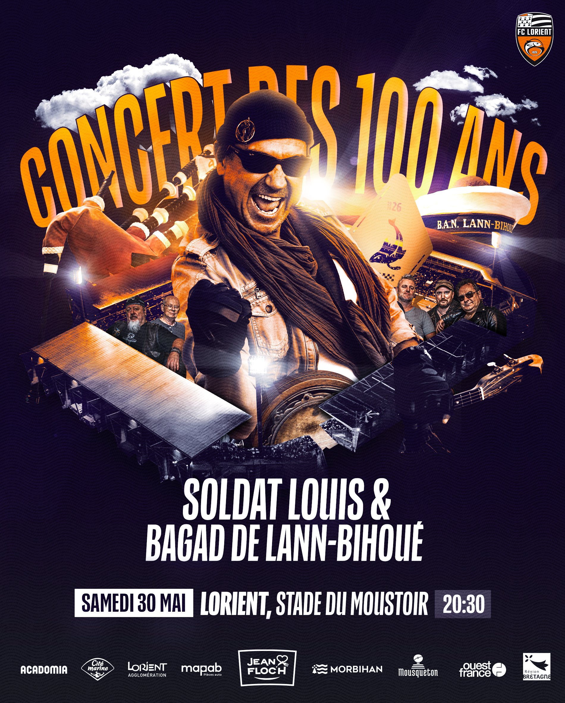 Pour clôturer les festivités des 100 ans du FC Lorient, le groupe Soldat Louis jouera en compagnie du mythique Bagad de Lann-Bihoué pour le concert événement du Centenaire, le 30 mai prochain au stade du Moustoir.